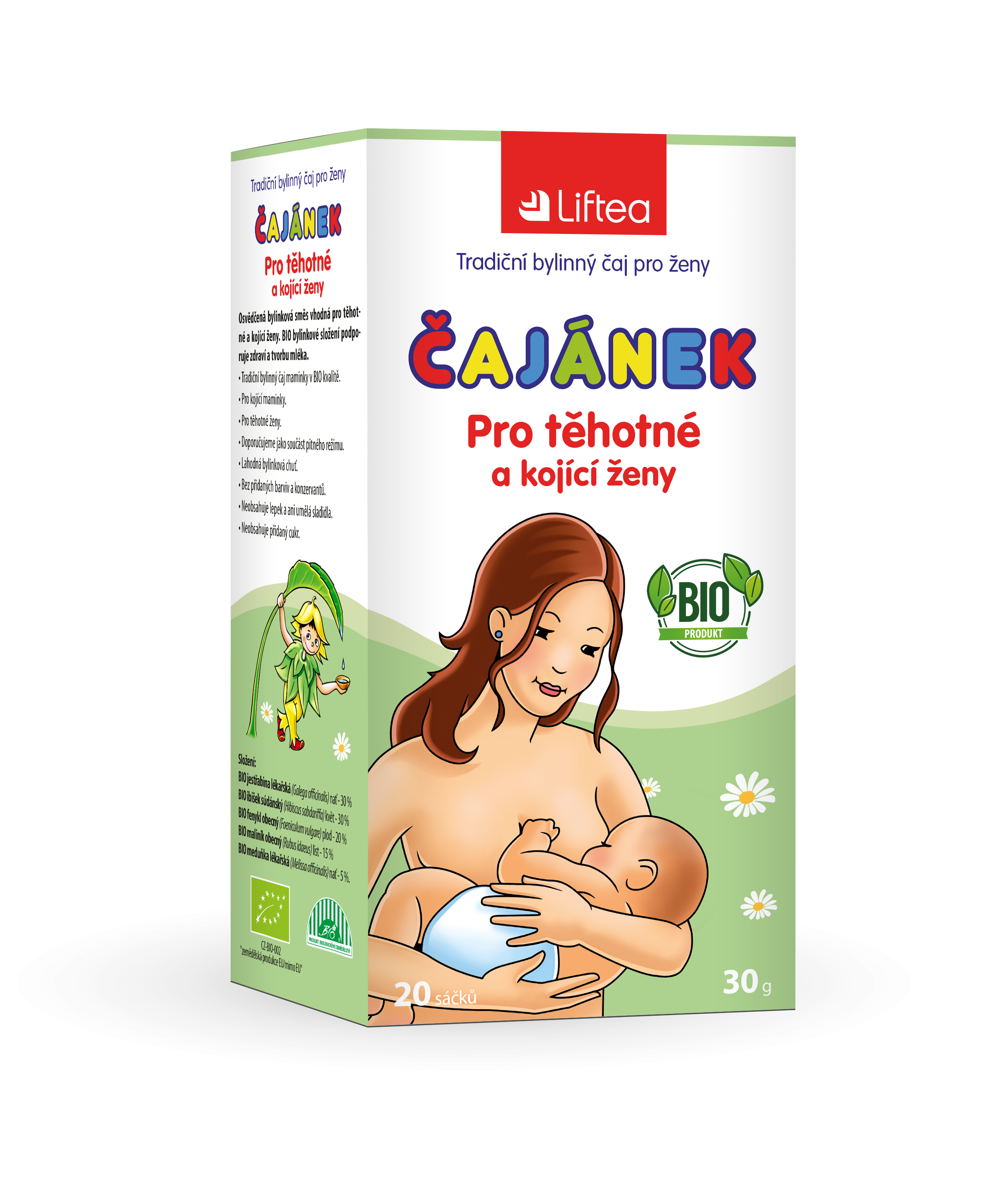 Liftea Čajánek Pro těhotné a kojící ženy je jemná bylinná směs vytvořená pro podporu přirozené tvorby mateřského mléka a pohody v období kojení. Obsahuje jestřabinu lékařskou, která podporuje laktaci a přispívá k očistě těla, levanduli pro zklidnění a harmonii maminky i miminka, fenykl pro úlevu od nadýmání a ibišek, jenž dodává čaji příjemnou chuť a vůni. Přírodní podpora pro krásné chvíle mateřství.