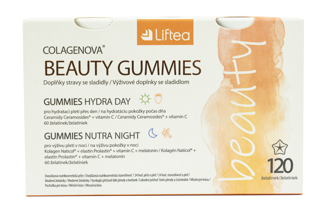 Liftea Colagenova Beauty Gummies je nutri-kosmetický doplněk stravy, který nabízí systematickou 24hodinovou péči. Denní péči zajišťují denní želatinky Liftea Colagenova Gummies HYDRA DAY a v noci vaši pleť vyživují želatinky Liftea Colagenova Gummies NUTRA NIGHT.