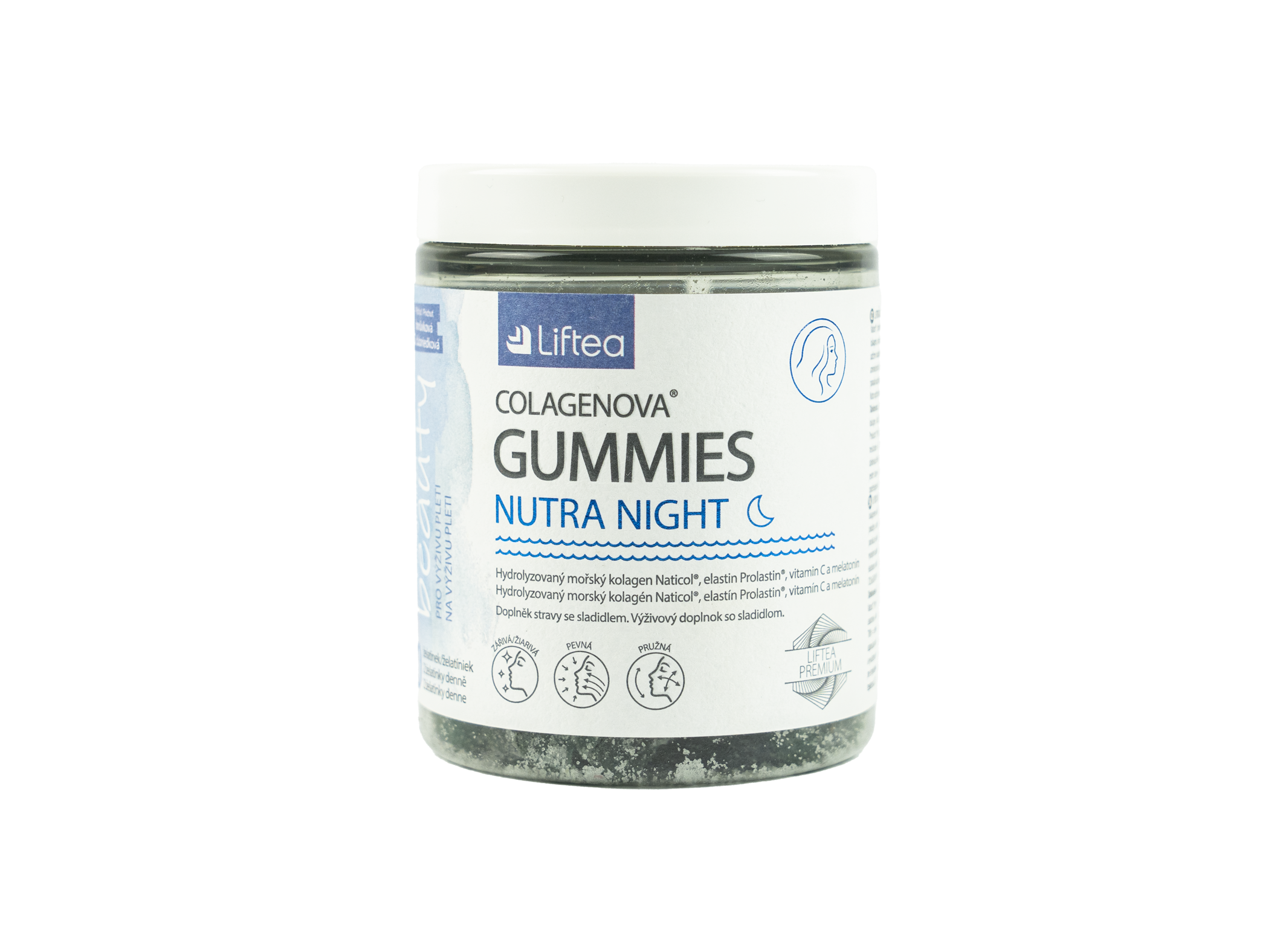 Objevte praktický doplněk stravy ve formě chutných želatinových bonbónů Liftea Colagenova Gummies Nutra Night, který podporuje regeneraci pleti během spánku a přispívá k její svěžesti a pružnosti. Složení obsahuje hydrolyzovaný mořský kolagen Naticol®, elastin Prolastin®, vitamin C a melatonin, což společně podporuje obnovu kožních buněk, relaxaci a noční obnovu pleti.